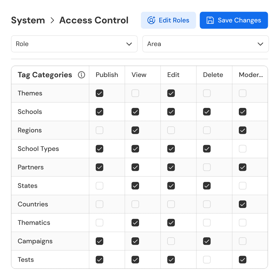 Segregated access for participants, researchers and core-team members with distinct permissions for data entry, tagging, and moderatio