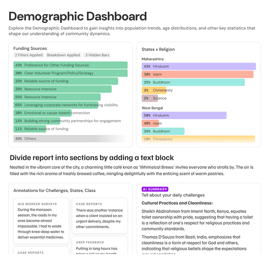 Enabled teams to surface common motivations, barriers, and enabling conditions for everyday giving across a large volume of qualitative data.
